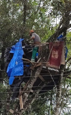 Com a crise econômica provocada pela pandemia de coronavírus em Curitiba, um homem de 39 anos construiu uma casa em uma árvore com pedaços de madeira e lona na Avenida Cândido Hartamann, próxima ao Parque Barigui, o mais famoso da capital do Paraná, e residia no local há uma semana.