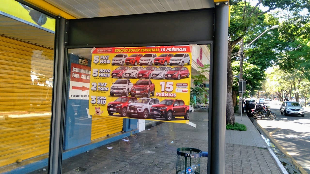 Os novos abrigos do transporte coletivo parece que foram terceirizados. Agora, o título de capitalização chamado Vale Sorte utiliza dos próprios públicos para fazer propaganda.