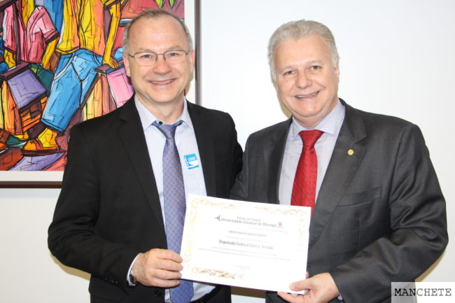 O deputado Edmar Arruda recebeu nesta terça-feira um certificado de agradecimento da Universidade Estadual de Maringá – UEM, pelo apoio que vem demonstrando à instituição ao longo da carreira pública.