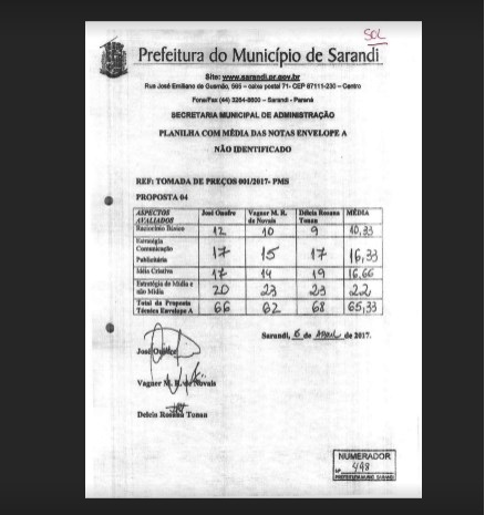 A licitação de publicidade em Sarandi se dá em duas etapas. Primeiro foi avaliado o envelope 3 e aberto o prazo recursal. Muitos recursos foram apresentados e ainda não foram julgados. Mas os resultados do Envelope I, que deveriam ser secretos e avaliados depois de julgados os recursos do Envelope 3, já são conhecidos.